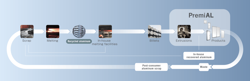 The PremiAL series lineup includes PremiAL for standard products with 50% fewer CO2 emissions, plus made-to-order PremiAL R70 containing 70% recycled aluminum and PremiAL R100 containing 100% recycled aluminum.